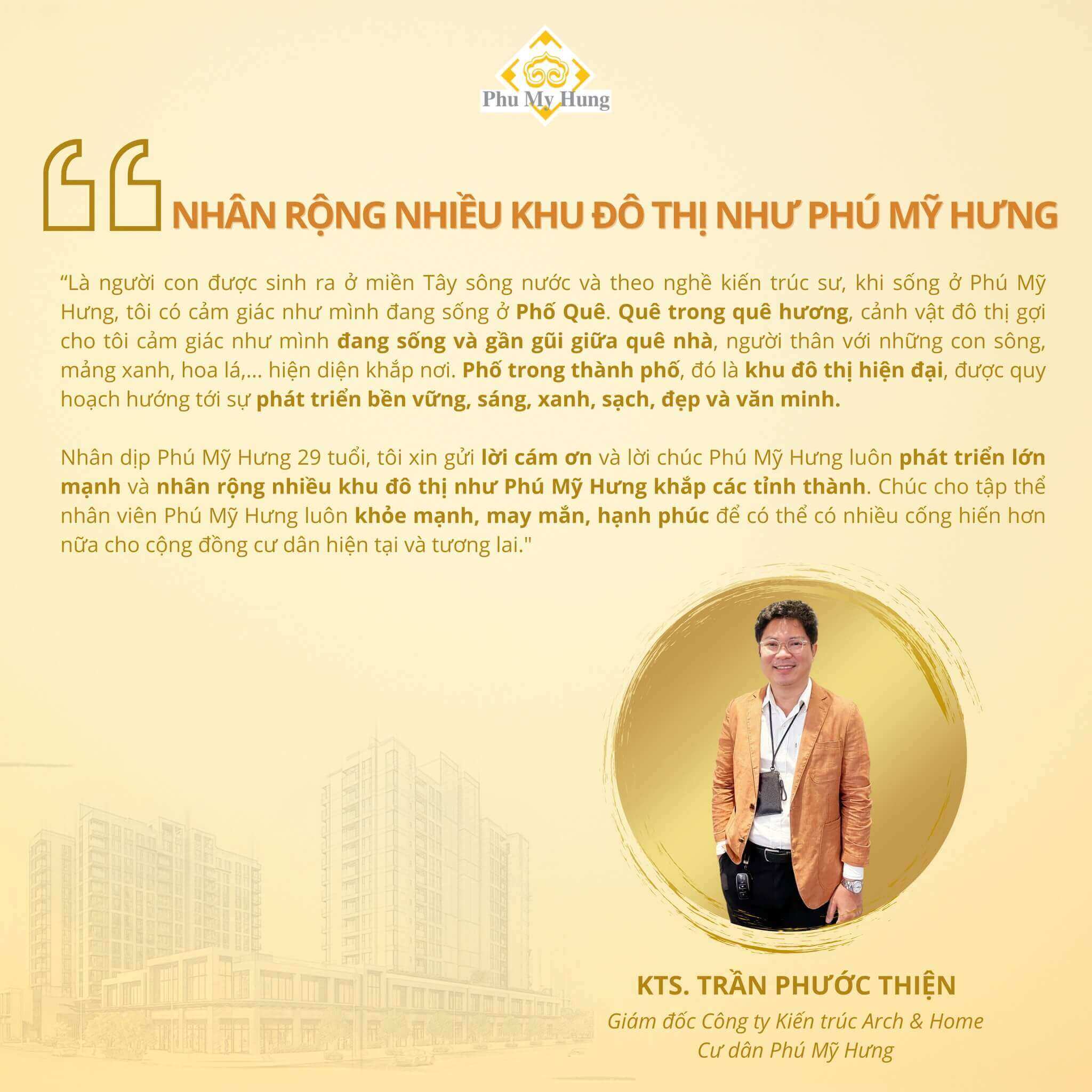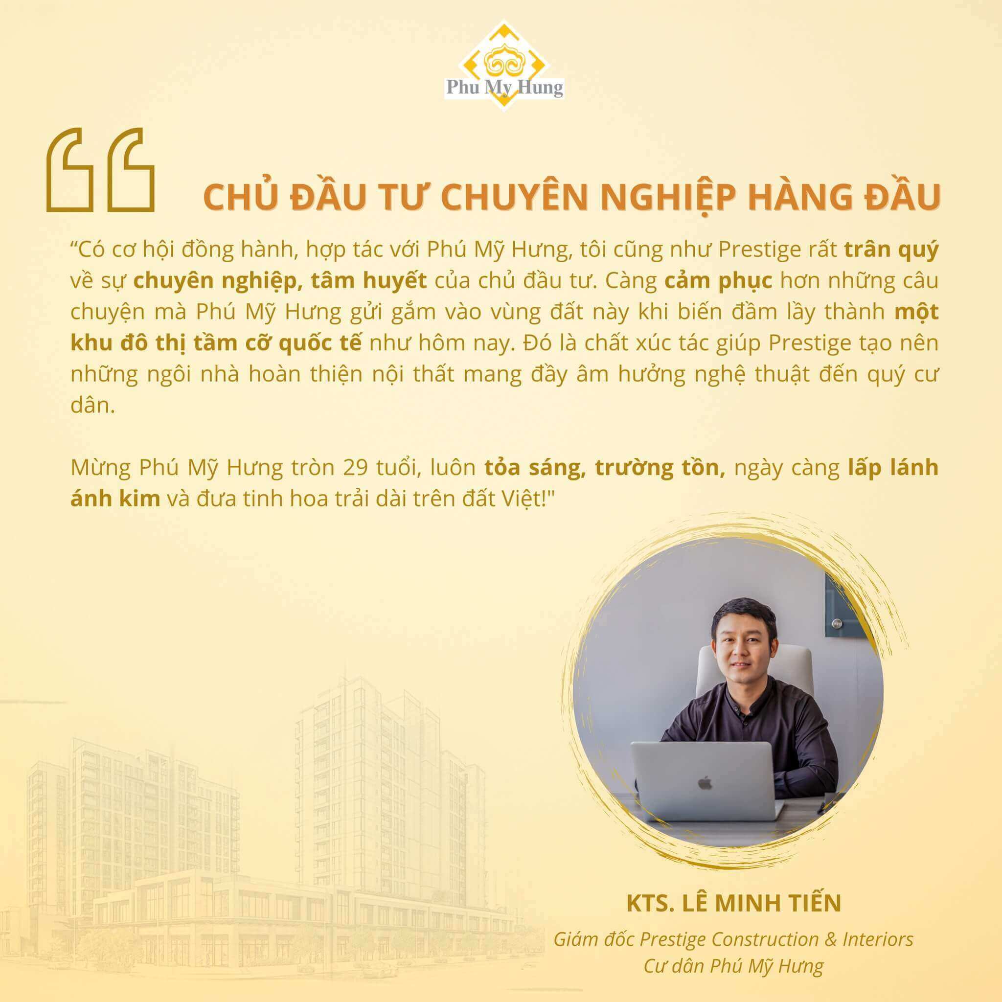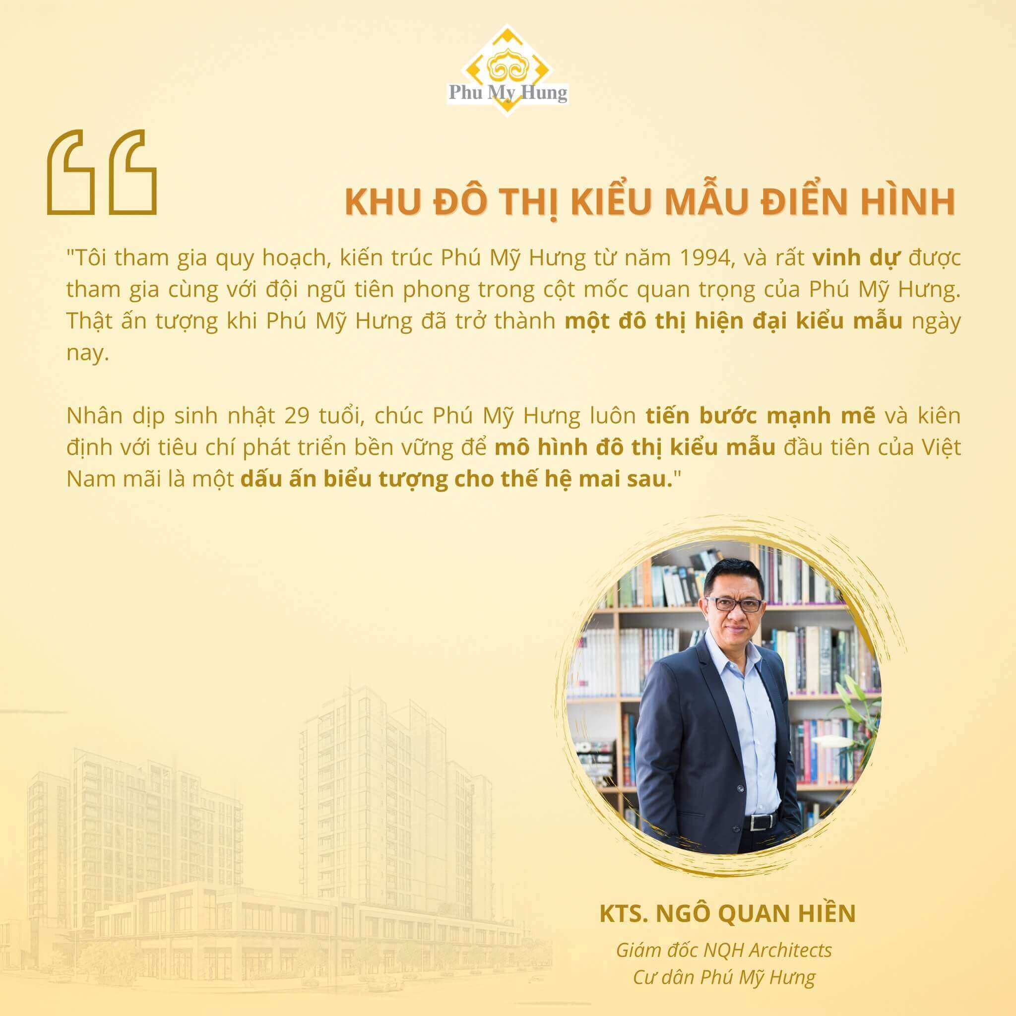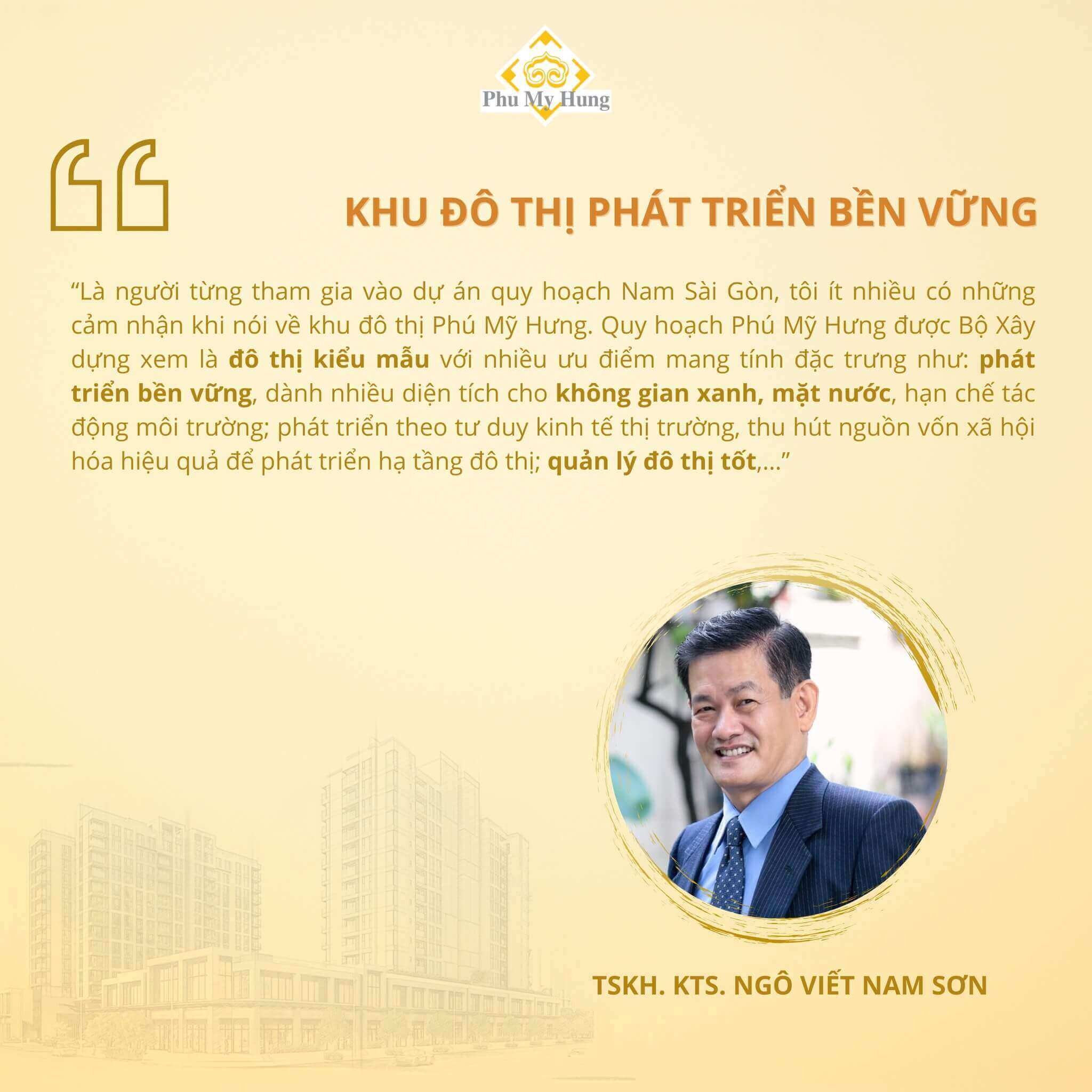 Công tác trong lĩnh vực kiến trúc – xây dựng, những chuyên gia, kiến trúc sư luôn có cái nhìn chuẩn xác về quy hoạch, cảnh quan, không gian sống… Họ là những người từng tham gia quy hoạch tổng thể khu Nam Sài Gòn, là đối tác của Phú Mỹ Hưng và đang là cư dân tại khu đô thị Phú Mỹ Hưng..